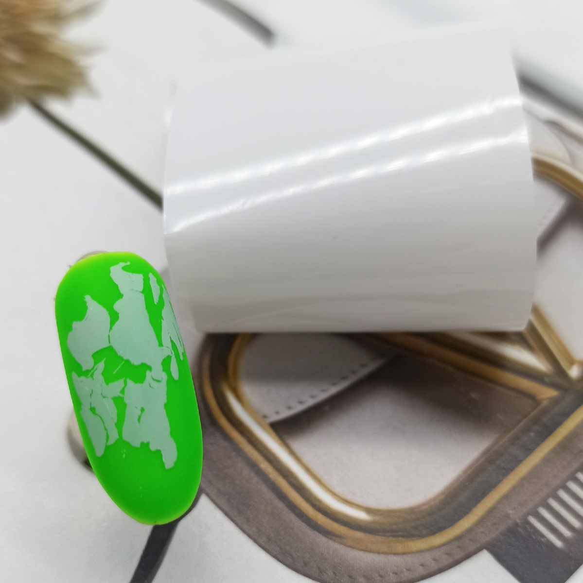 Полимеризуем клей в лампе в соответствии с инструкцией, а затем прикладываем к ногтю переводную фольгу.