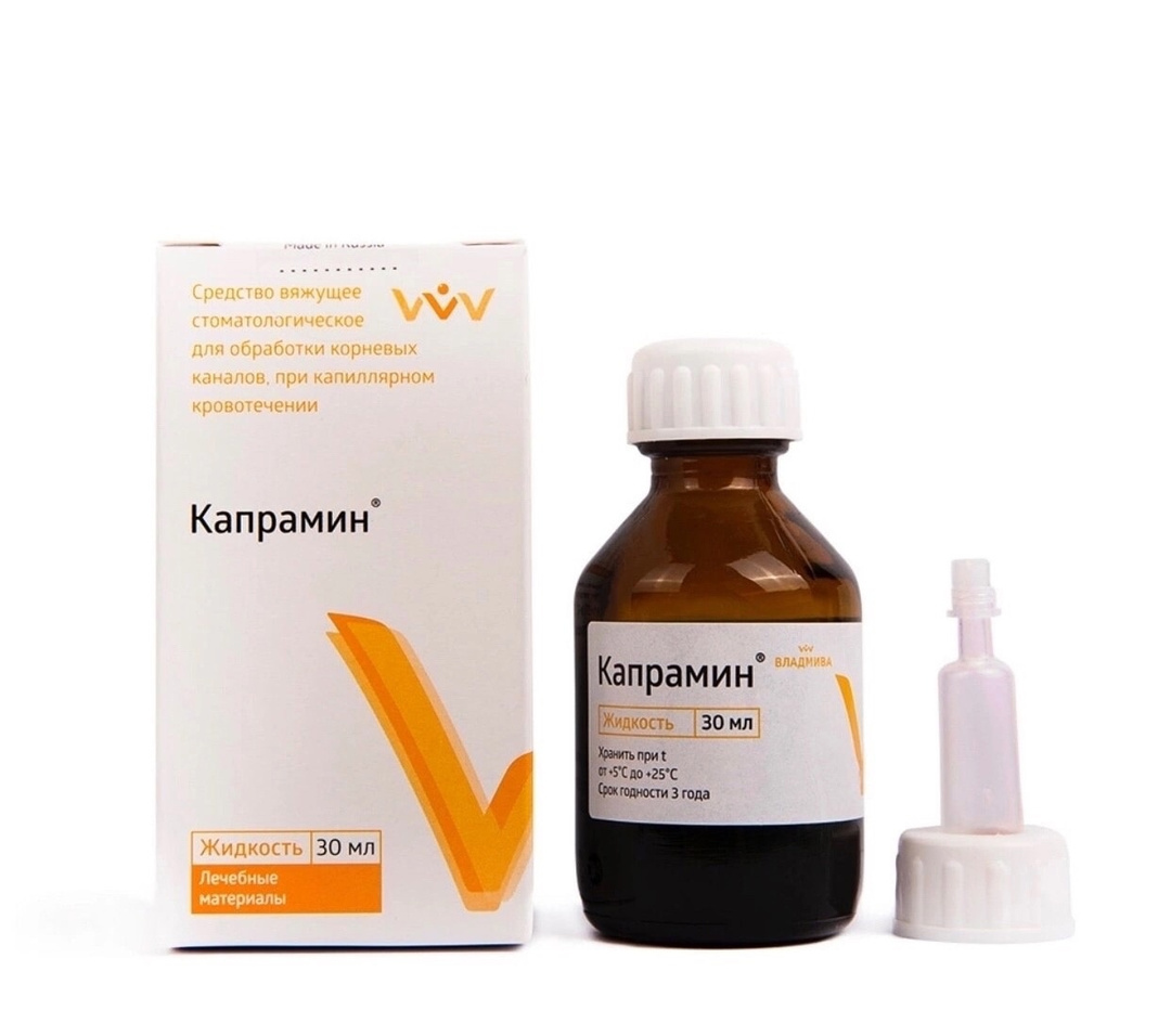 Материал «Капрамин» не токсичен, прост в применении, не вызывает изменения цвета тканей, легко смывается струей воды.