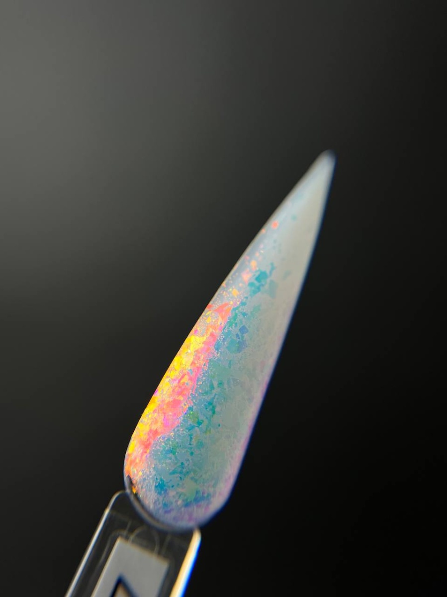 Цветные хлопья можно добавить в гель лак или топ, либо смешать с базой. Отлично смотрятся на натуральных и наращенных ногтях любой длины