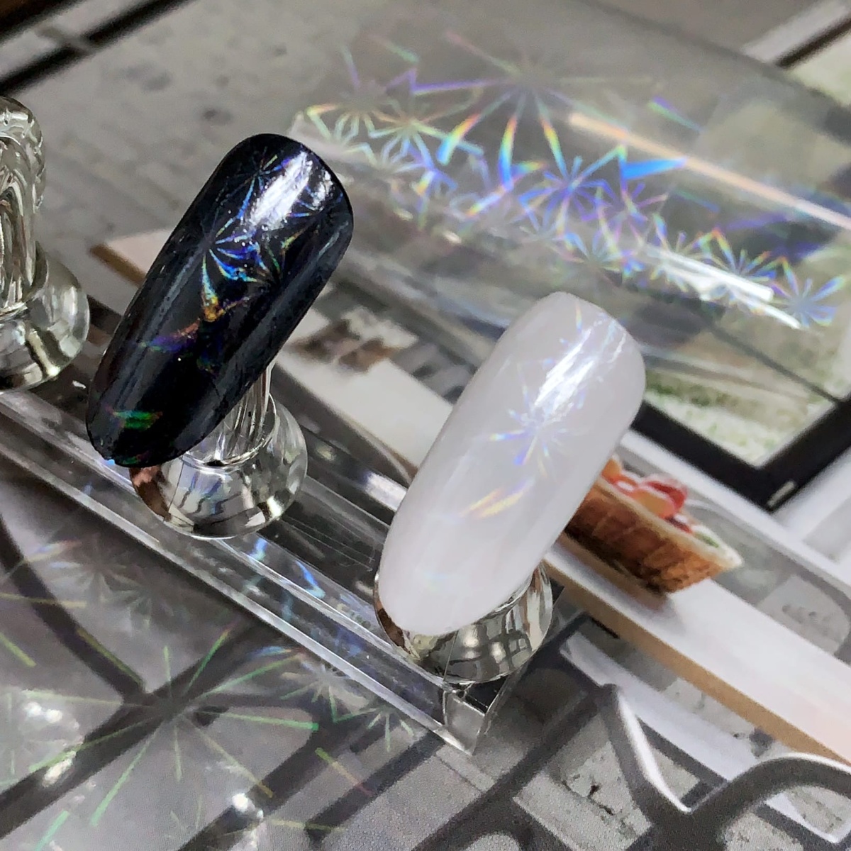 Полимеризуем клей в лампе в соответствии с инструкцией, а затем прикладываем к ногтю переводную фольгу.