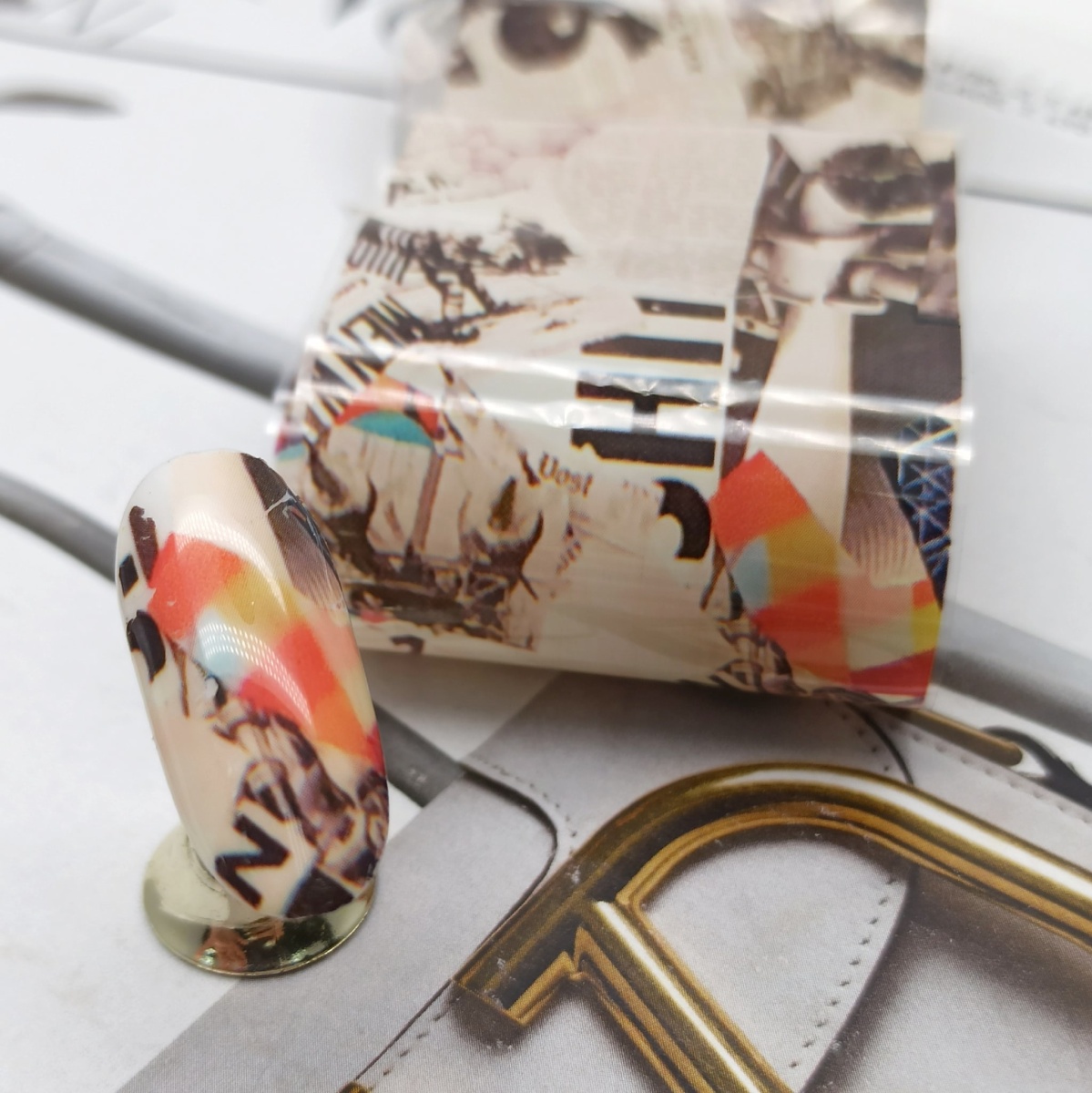 Полимеризуем клей в лампе в соответствии с инструкцией, а затем прикладываем к ногтю переводную фольгу.