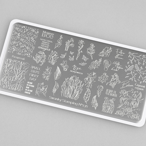 Нежная пластина весенне-летнего сезона, наполненная, как одиночными рисунками, так и паттернами цветов, птиц и надписей, имеющий тонкий, мечтающий характер. Дизайн прекрасно подойдет для техники реверсивного стемпинга. Все элементы можно разукрасить в любой цвет и украсить маникюр утонченной, романтичной натуры.